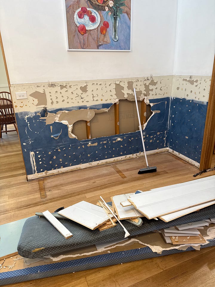 Then it was time to remove the bench seat on the far wall of the kitchen before the cabinet makes came to measure it up for the new bench. I swear to goodness people, before you liquid nail anything to the wall, spare a thought to the people who might live in the house after you. Liquid nails is a wonderful thing, yes. But I have come up against it too many times for me to advocate for it’s liberal use. I (and by that I mean Blake) now has to re-sheet and patch the wall!