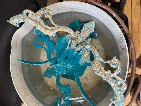 So nack to the lights. I tried to paint strip them, but Blake got me the less toxic version of it and it just isn’t as effective as the full proper stripper, so after a couple of hours of that I gave up and looked at another option. It seems I could boil the paint off so I had to un-wire the lights and find an old pot big enough to hold them. The only one I had is this old aluminium one, and it took me far too long to work out that it wouldn’t work on the induction plate so I tried to use the Weber to bring it to the boil.