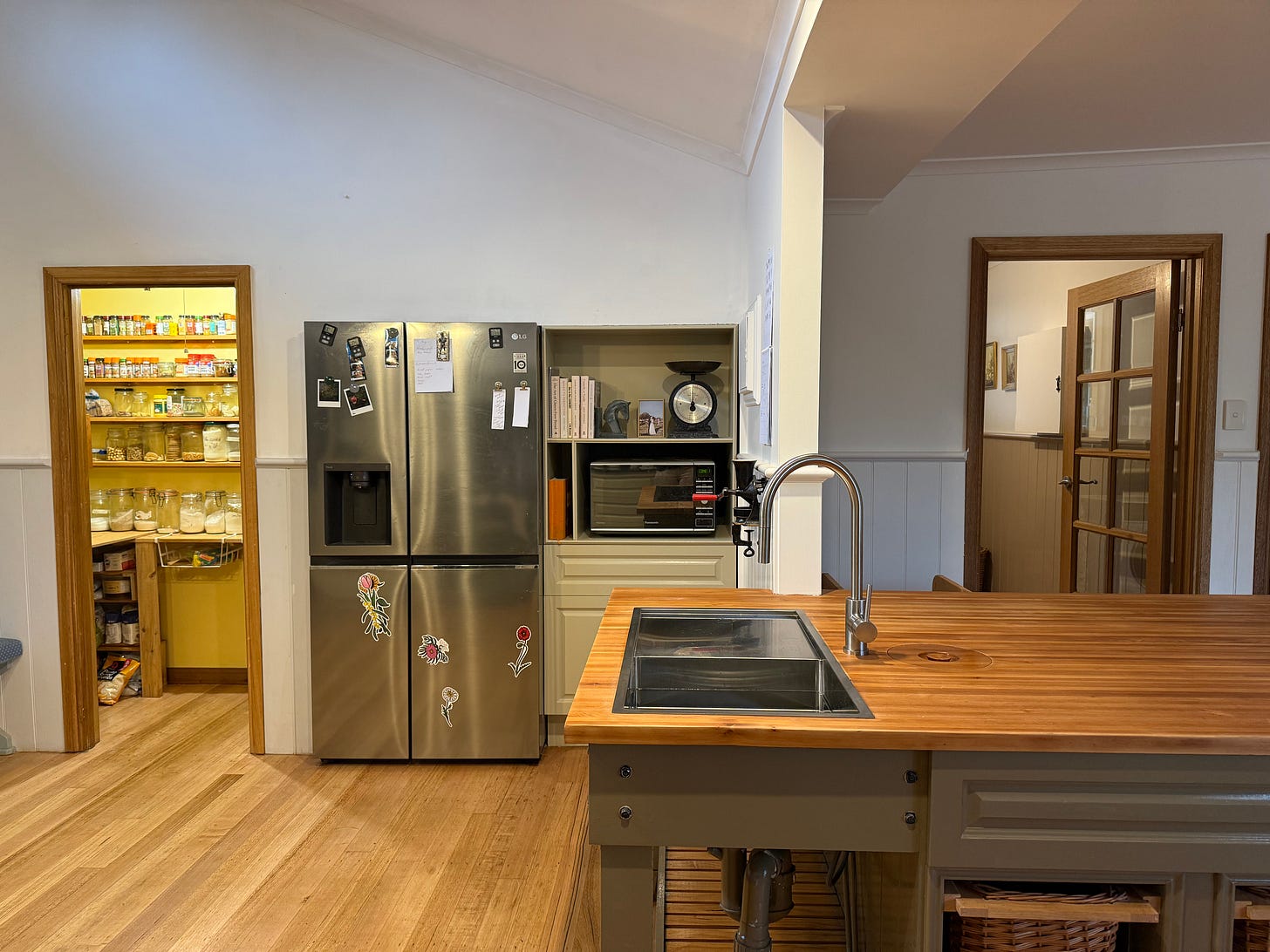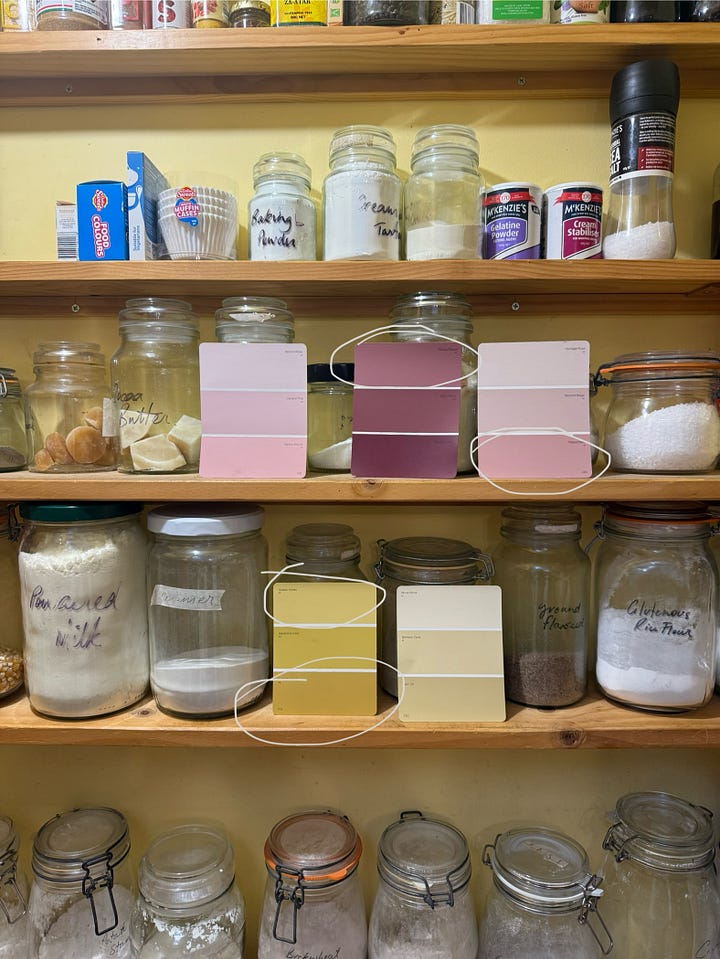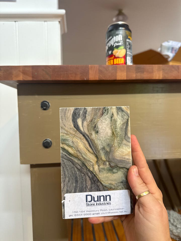 For those playing along at home, I did choose this for my bench top! A few of you commented after my last dispatch and that helped me to realise life is indeed really short and to choose the things that spark joy, and this one does. My plan for the pantry is to colour drench it after the new bench is. I will wait until the specific piece of stone is in and I’ll pick a tone from it, but I am leaning towards either a pink or a yellow at this point.