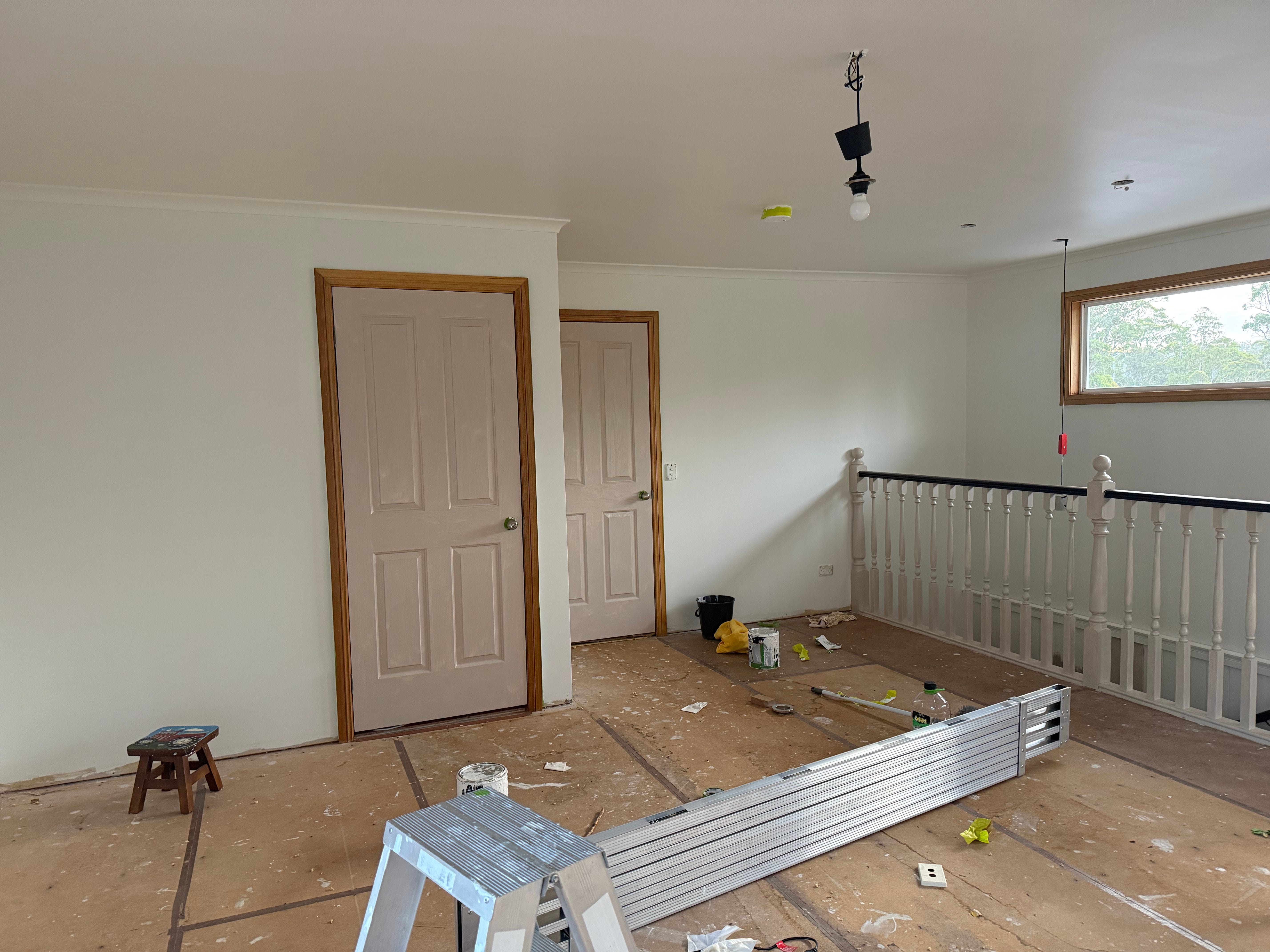 I have chosen half strength Mousey for the doors and banisters up here. Full Mousy is the colour I painted the mudroom, if you remember. In half strength it’s a really nice soft, beigy, pinky tone that plays so nicely with the Antique White USA on the walls (this was only after the first coat so ignore the blue in the walls). The doors make me want to put in some amazing floral curtains, but I might have to convince Blake of that one.