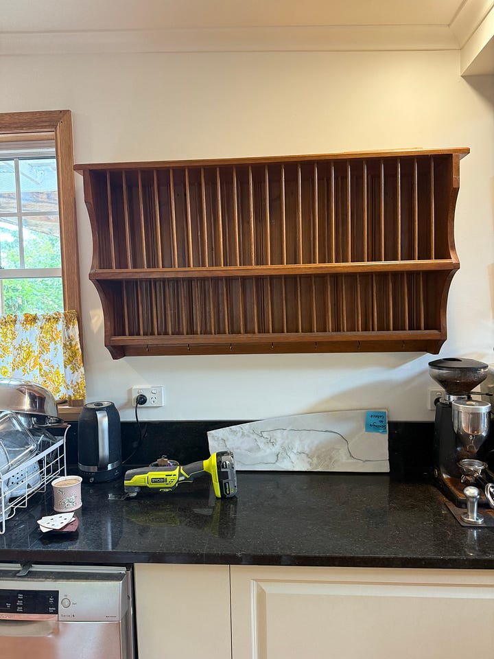 And then next (I really was on a roll), armed with nothing but my new multi-tool and my overinflated sense of my own competence, I removed the spokes from the bottom half of our plate rack. We have nothing that fits so it was always just going to sit empty and annoy me. Now, with the spokes removed it’s a great little tea and coffee shelf and gets a few more things off the bench top - I love a clean bench top.