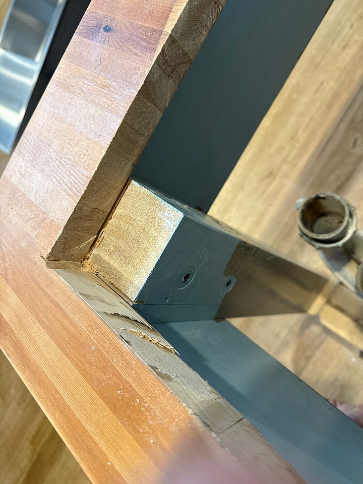 I have to admit, I was packing it doing the cutting. This would have been an insanely expensive repair if I had cut the opening too far, or otherwise messed up the benchtop. I hit a snag almost immediately when I realised I had not accounted for this corner leg when I measured for the sink! My only option, really, was to notch it out, which gave me an excuse to buy a multi-tool, which I now love.