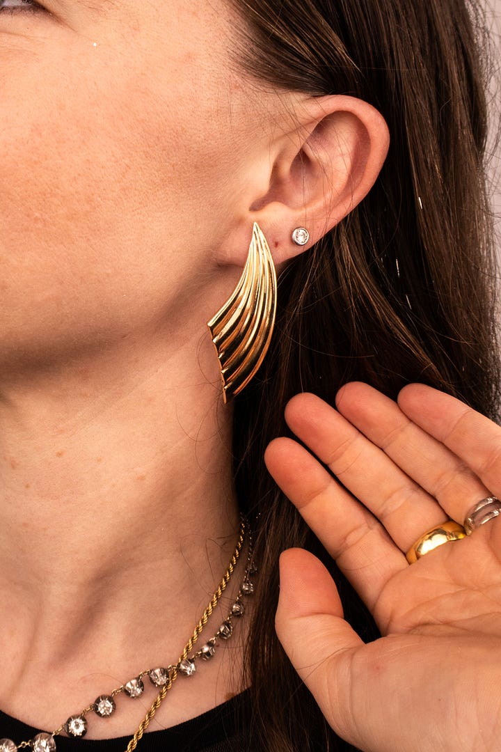 The first pair are these amazing, like, 1960’s futuristic, stunning earrings. When I bought them the post was in the very middle back so that the earring sort of sat over your whole ear, which was too much for me. So I moved it up and love the way it sits and catches the light. 14ct, $1490aud